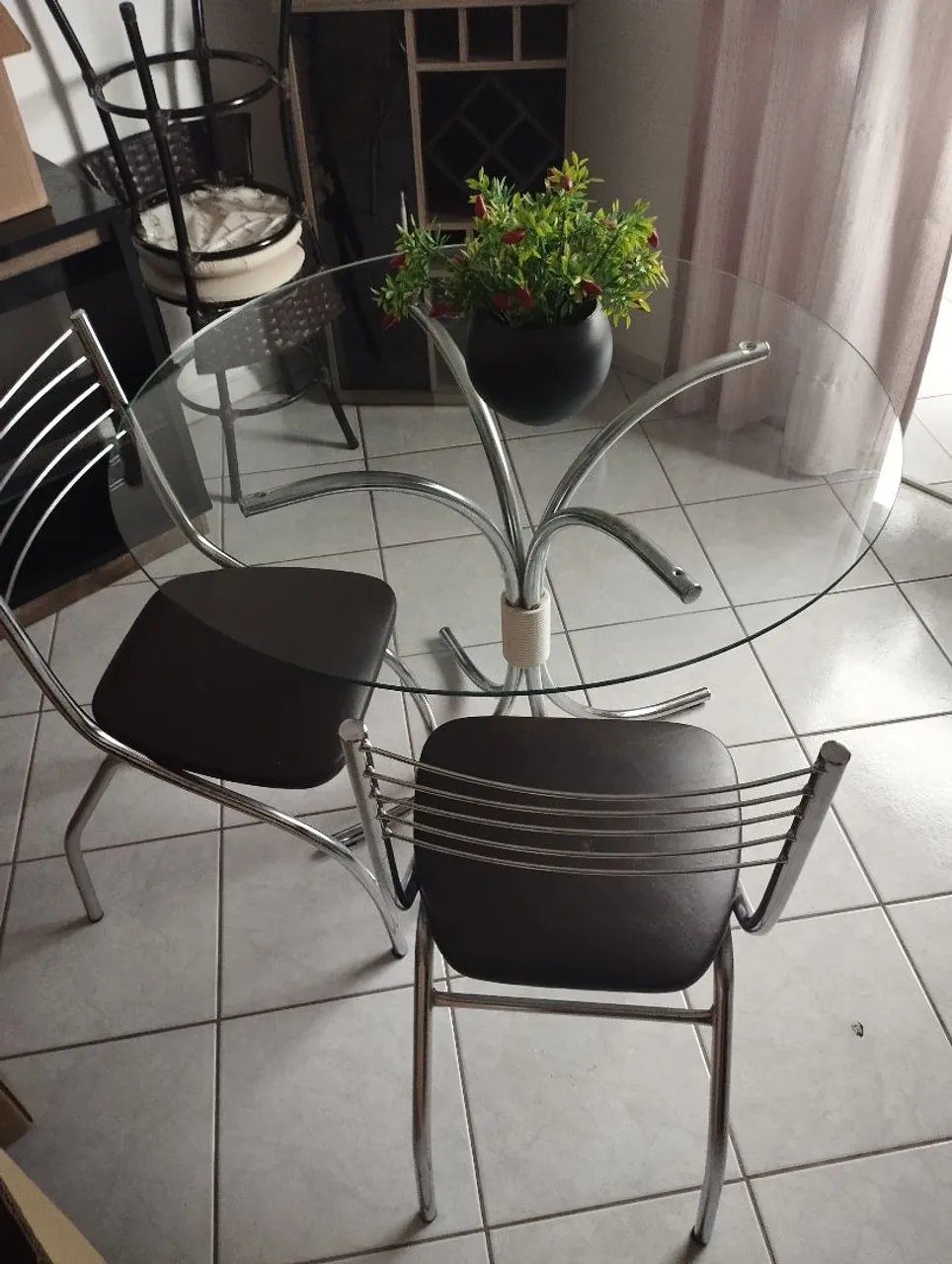 Linda mesa redonda com 4 cadeiras, perfeita para sua sala de jantar ou cozinha. Design moderno e elegante que combina com qualquer ambiente. Ideal para reunir a família e amigos.