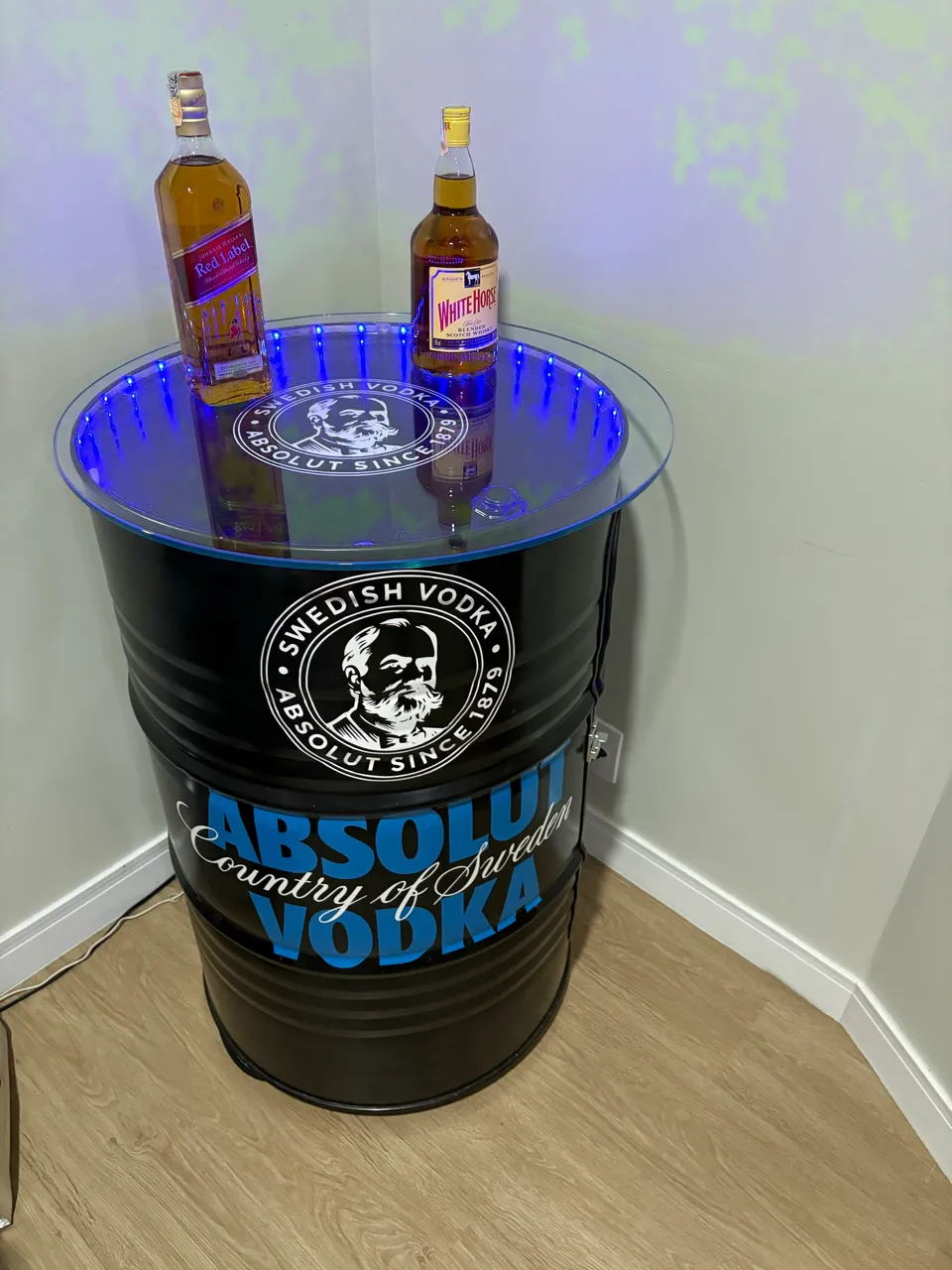 Lindo tambor personalizado com design exclusivo, equipado com porta e iluminação LED, ideal para dar um toque especial ao seu ambiente. Perfeito para quem busca estilo e funcionalidade.