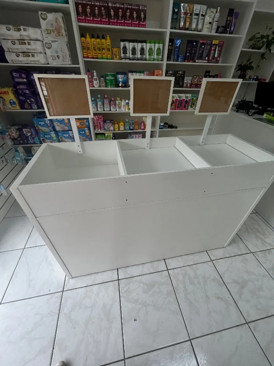 Cestão em MDF, resistente e espaçoso, perfeito para destacar promoções e aumentar as vendas no ponto de venda.