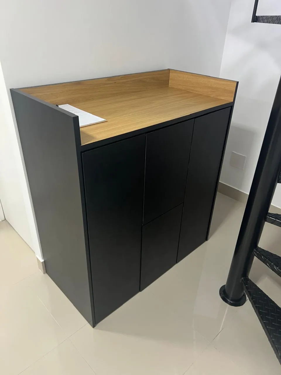 Bancada móvel com rodinhas, gavetões e prateleiras. Está em estado de novo.