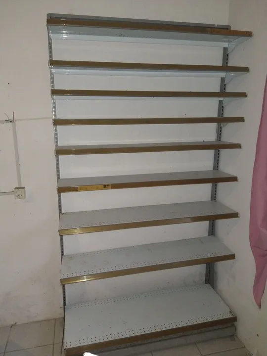 Rack de parede em ótimo estado, ideal para organizar produtos em lojas, com diversas prateleiras e estrutura resistente.