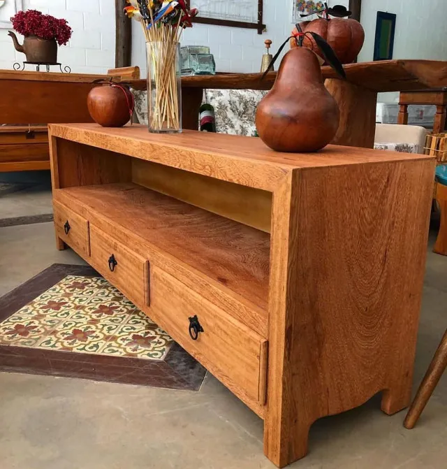 Rack em madeira de angelim, acabamento acetinado. Móvel novo fabricado sob encomenda.