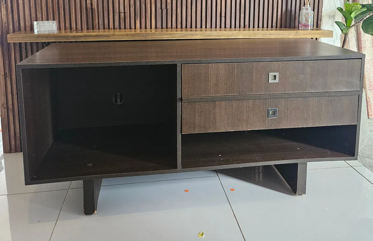 Rack de MDF usado com pequenos desgastes. Medidas: 50cm profundidade, 1,36 comprimento e 65cm de altura