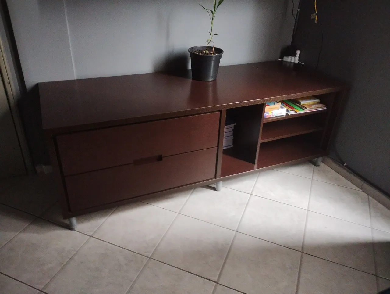 Rack de madeira marrom com gavetas e prateleiras, ideal para organizar sua sala de estar. Design moderno e elegante.