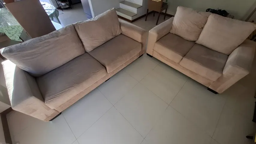Estrutura e tecido estão excelentes, sem rasgos nem nada quebrado. A espuma do sofá de 3 lugares está levemente cansada, mas ainda firme. O sofá de 2 lugares parece novo.