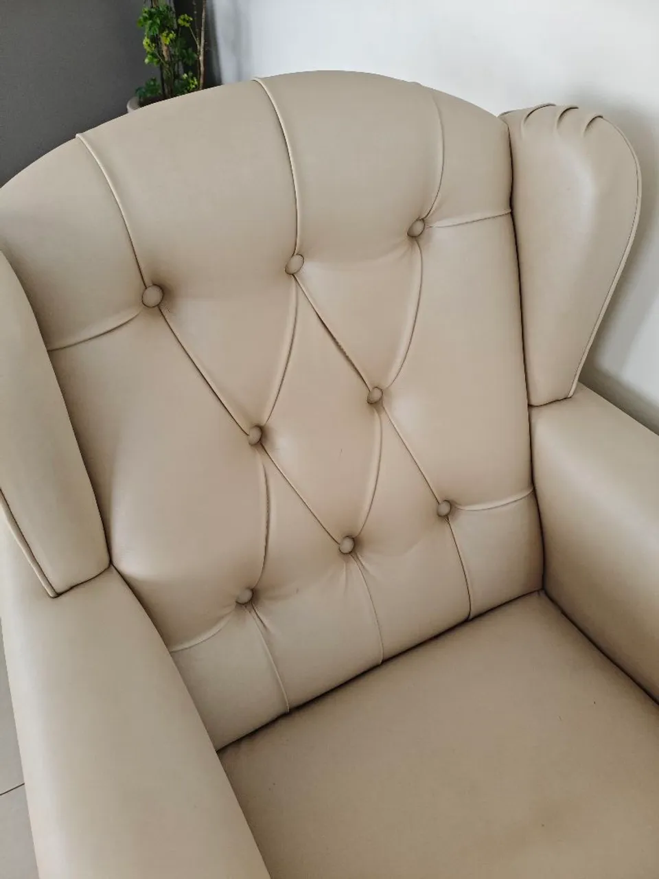 Poltrona de balanço, estofada na cor bege, muito confortável. Possui apoio para os pés e encosto acolchoado com acabamento em capitonê. Ideal para descanso, leitura ou amamentação. Produto usado, em bom estado de conservação.