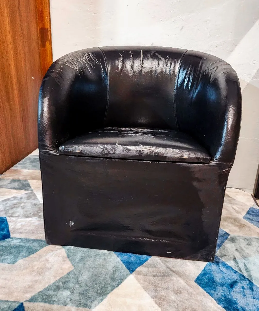 Vende-se poltrona de couro sintético preto com design arredondado, similar à poltrona Granada, que apresenta desgaste exclusivamente no couro sintético.