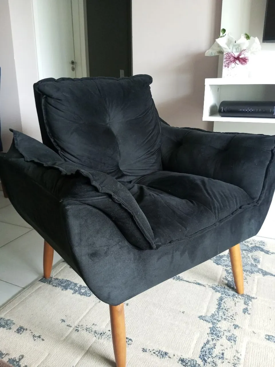 Desfrute do conforto e elegância com esta poltrona preta, perfeita para relaxar e dar um toque sofisticado ao seu espaço.