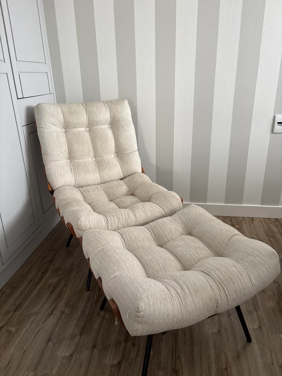 Desfrute do conforto e elegância com esta poltrona costela, acompanhada de um puff que complementa o seu descanso. Perfeita para relaxar após um longo dia ou para adicionar um toque de sofisticação ao seu ambiente.