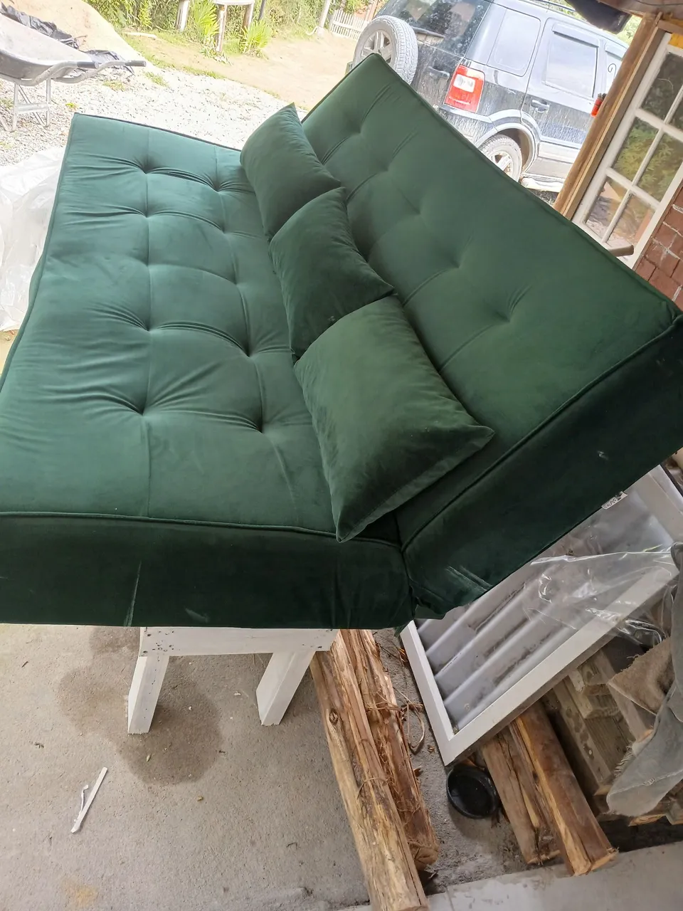 Vendo sofá retrátil de 3 lugares e super elegante. Ideal para sala de estar ou quarto. Revestimento em veludo verde,macio ao toque e com design moderno que valoriza o ambiente.