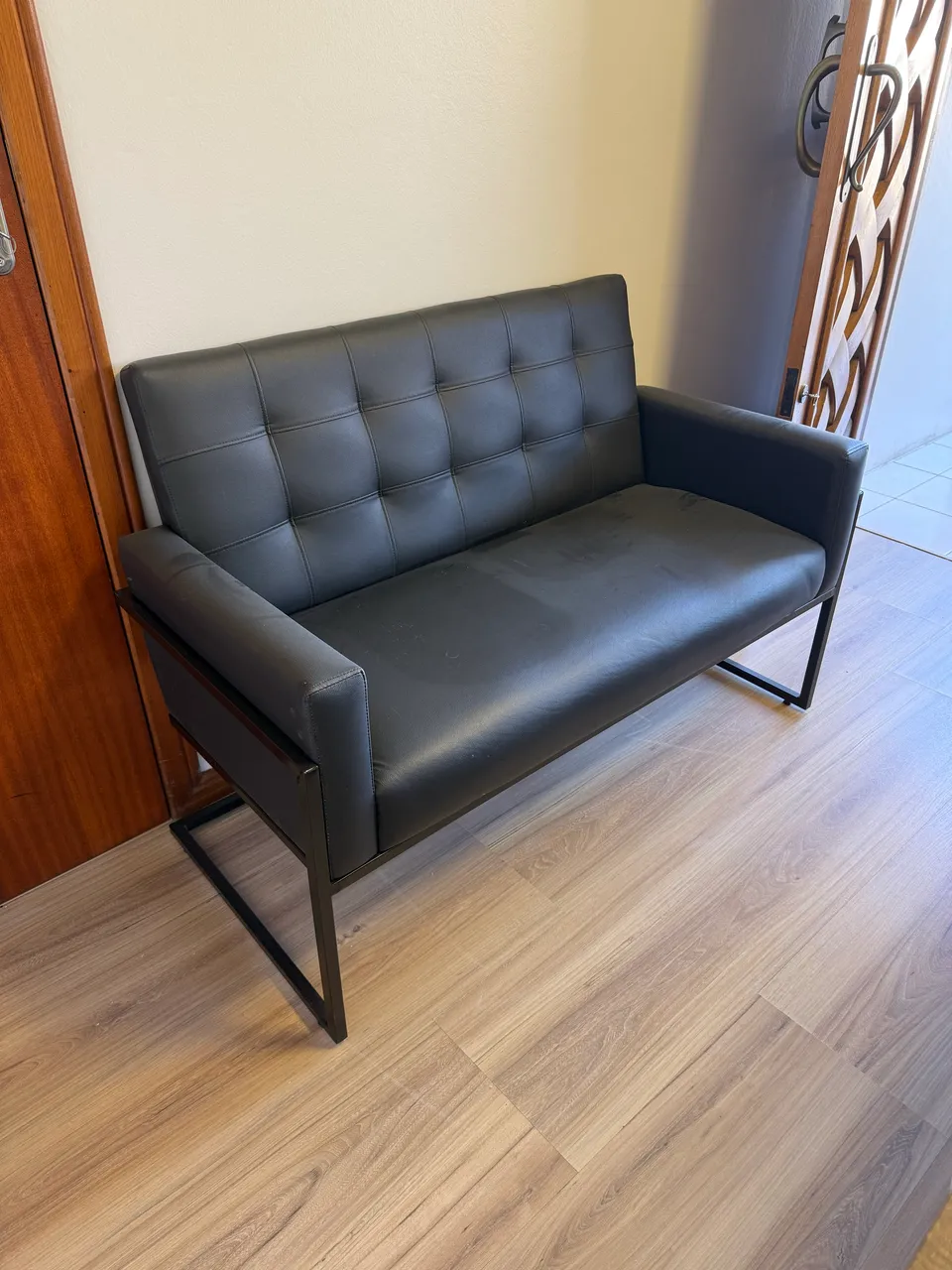 Sofá namoradeira preto com base em ferro, design moderno e elegante para compor sua sala de estar. Conforto e sofisticação em um só móvel! Em perfeito estado.