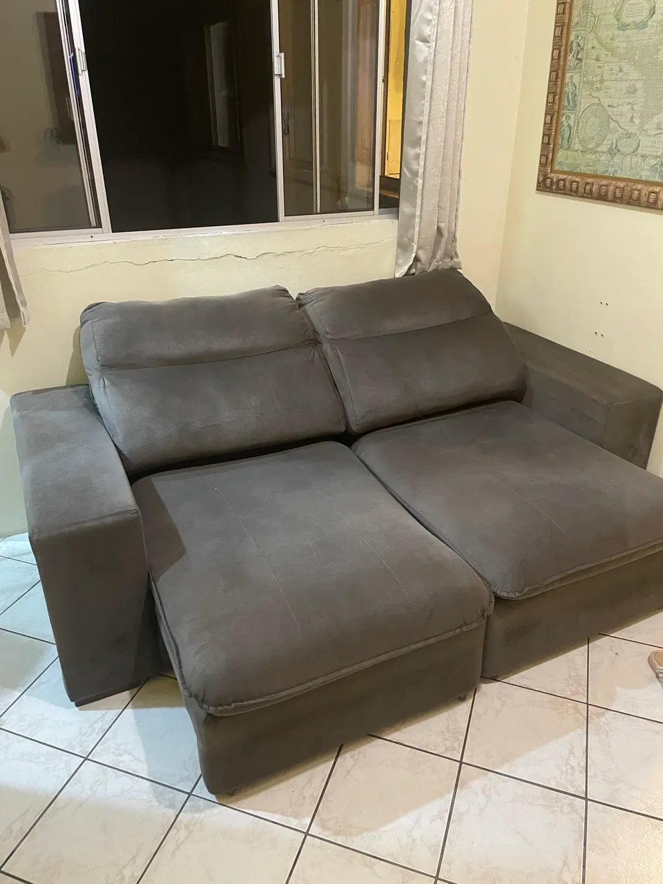 Sofá marrom usado, se encontra um pouco desbotado por conta do sol, mas em geral está em ótimo estado