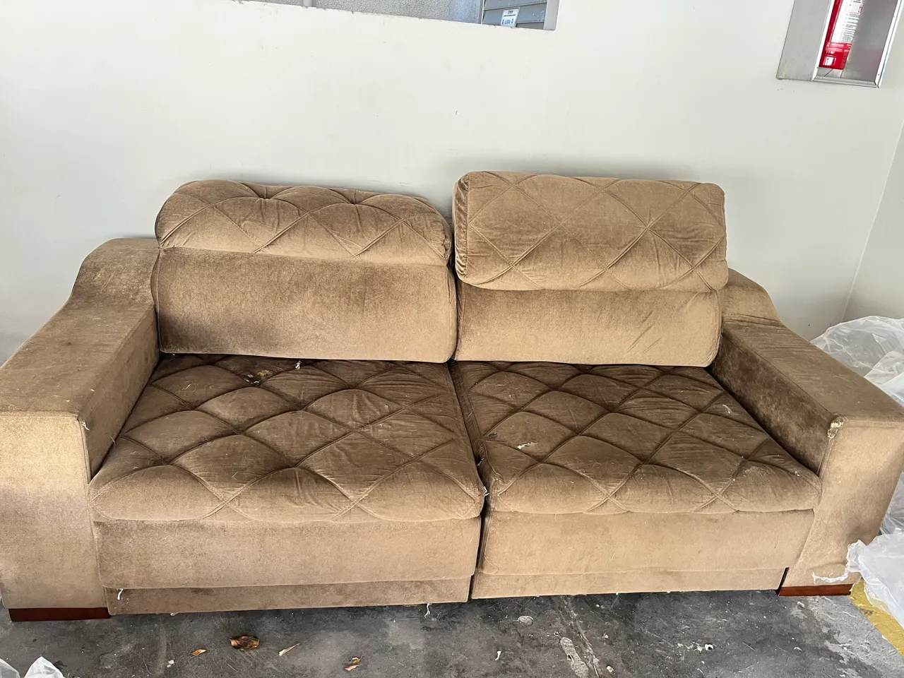 O sofá é retrátil, de 4 lugares, como visto nas fotos. Ele está com alguns rasgos que meu cachorro fez, mas nada que não dê para consertar. Nós nos comprometemos a pagar uma higienização completa do estofado antes de entregar. Ele tem que ser buscado aqui no bairro Capoeiras, infelizmente não podemos levar.