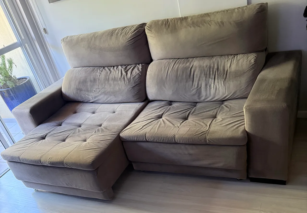 Sofá retrátil manual usado e na cor cinza. Medidas: 2,30 x 0,90 Possui desgaste na cor em ambos os braços por conta de iluminação solar.