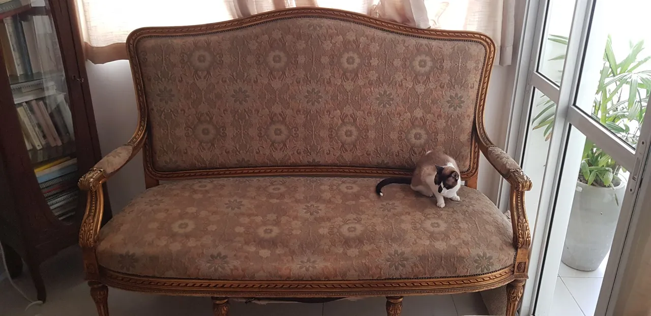 Sofá vintage espaçoso e elegante, ideal para dar um toque de requinte à sua sala. Design clássico e confortável para momentos de relaxamento. PEÇA ANTIGA PRECISANDO DE REPAROS.