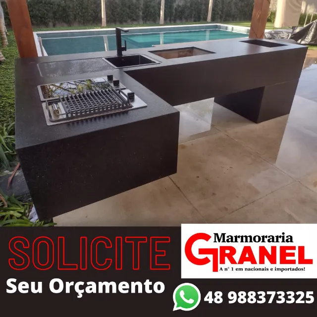 Cozinha gourmet externa completa em granito, perfeita para receber amigos e familiares. Com churrasqueira, pia e bancada, ideal para preparar refeições deliciosas ao ar livre. Design moderno e elegante, que agrega valor à sua área externa.
