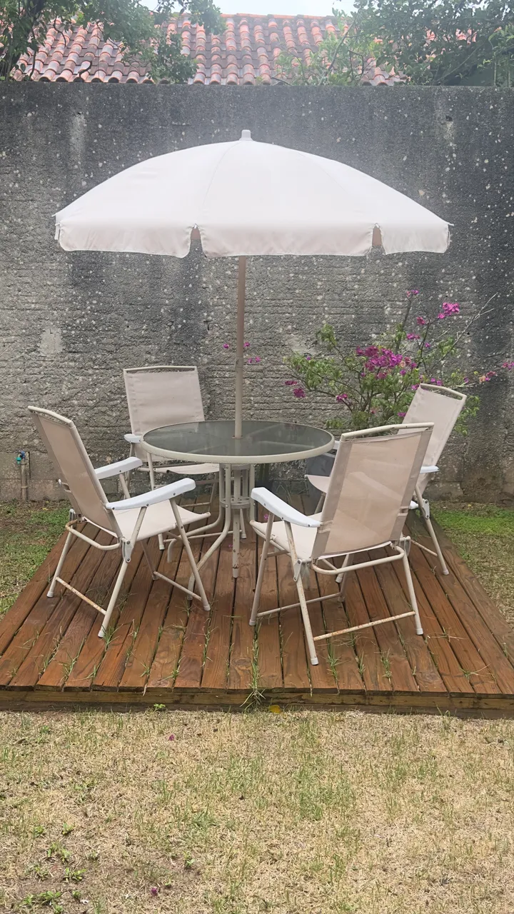 Conjunto perfeito para sua área externa! A mesa com tampo de vidro e as cadeiras confortáveis proporcionam momentos de lazer e relaxamento. O guarda-sol gigante, oferece sombra e proteção, ideal para aproveitar os dias ensolarados.