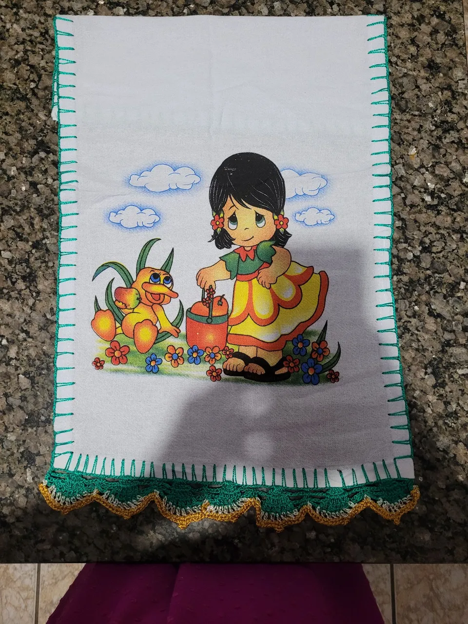 Lindo pano de prato com bordado e acabamento em crochê. Perfeito para dar um toque especial e charmoso à sua cozinha!
