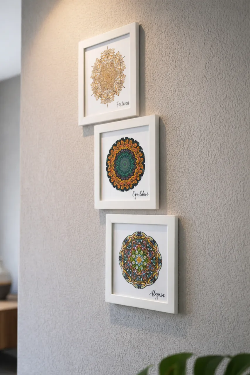 Lindo kit de 3 quadros decorativos de mandalas, cada um representando uma energia especial: Fortuna, Equilíbrio e Alegria.
