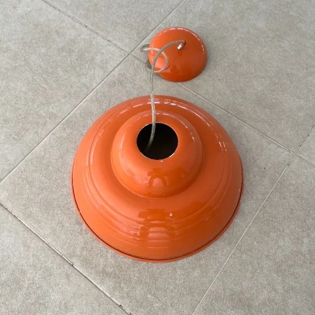 - Duas luminárias em formato de cúpula, sendo uma na cor laranja e outra branca;