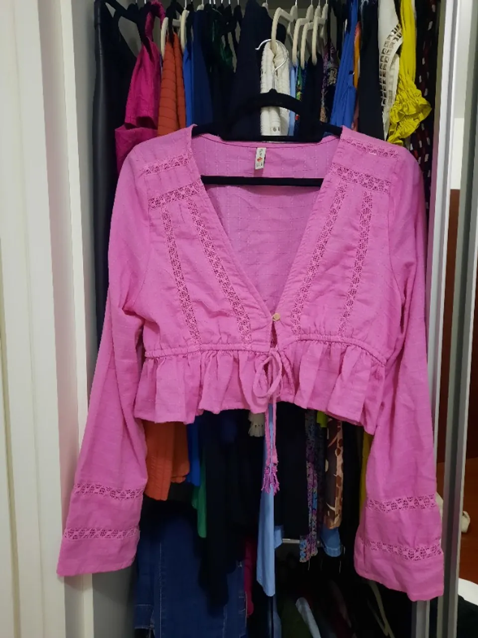 blusa cropped rosa com detalhe em botão, amarração frontal franzida e com miçangas.