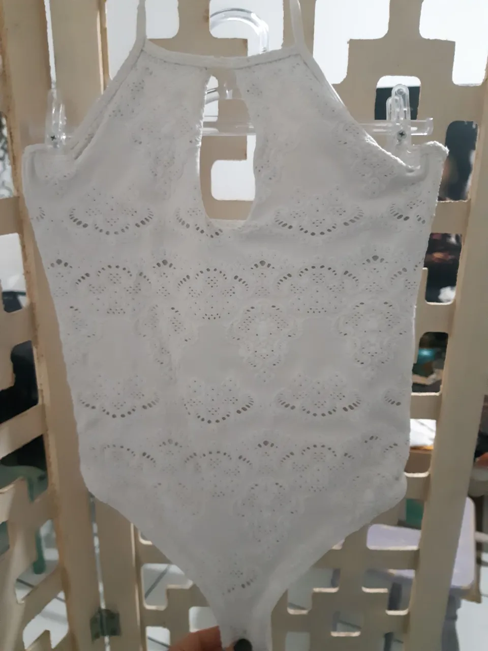Bodie branco, detalhe na custura, muito lindo, tem decote na frente.