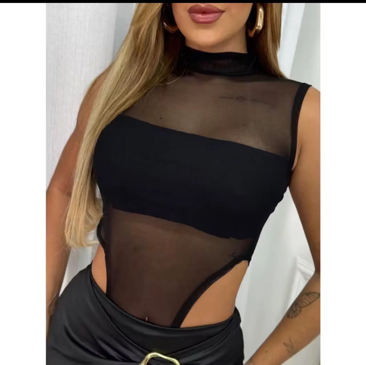 Body cavado em tule preto, perfeito para um look moderno e sensual. Detalhes que valorizam sua beleza e te deixam confiante. NUNCA USADO
