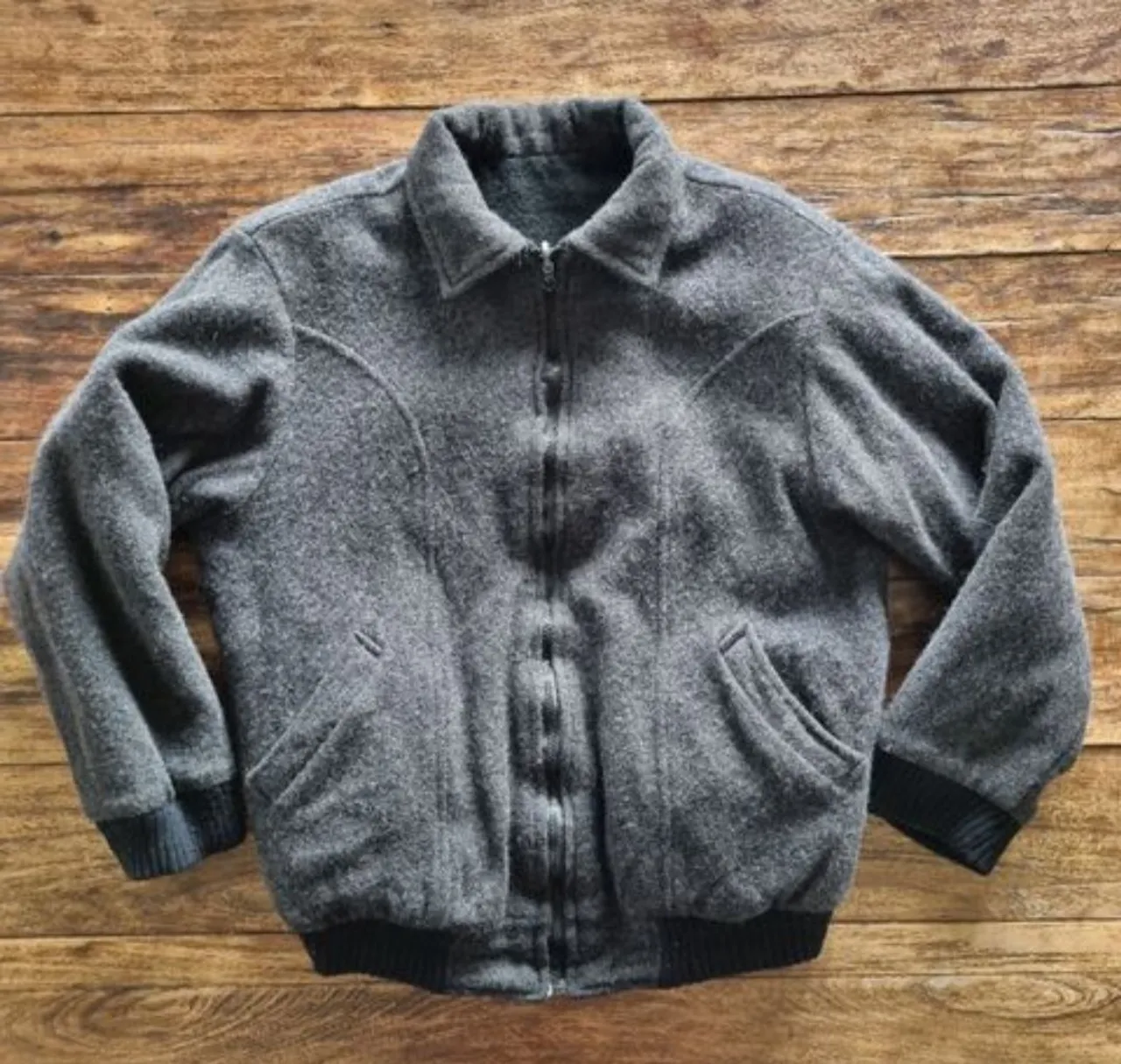 Jaqueta de lã cinza e preta, reversível, víntage, estilosa e confortável. Perfeita para os dias mais frios, combina com diversos looks. Possui bolsos e fechamento por zíper.
