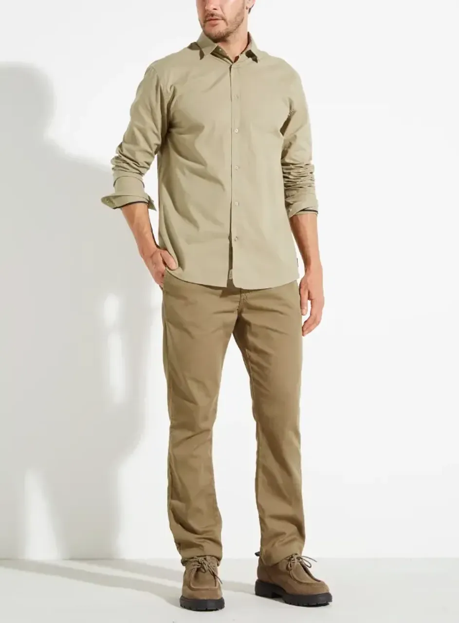 Calça Masculina Sarja Cáqui - Vitor: Modelagem slim, cintura média com cós e passantes, fechamento por botão e zíper, bolsos frontais e traseiros funcionais. Barra com acabamento tradicional e etiqueta da marca no cós traseiro.