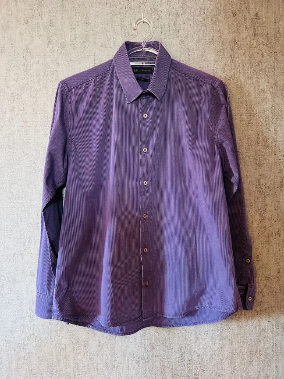 Camisa social Makenji, listras finas em vinho e branco, slim fit, tamanho 2. Medidas aproximadas nas imagens. Usada e bom estado.