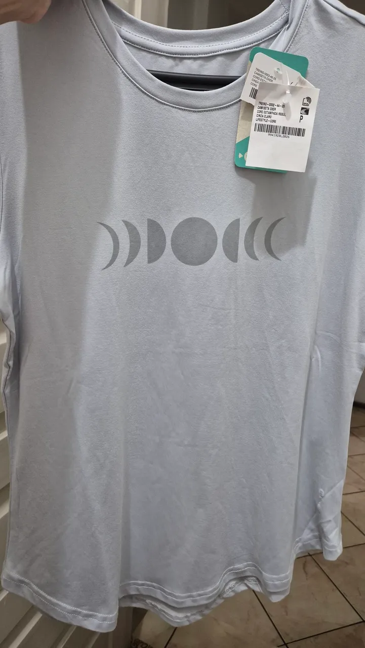 Linda camiseta cinza da Oxer com estampa de fases da lua, ideal para quem busca estilo e conforto. Perfeita para treinar. Nova, com etiqueta