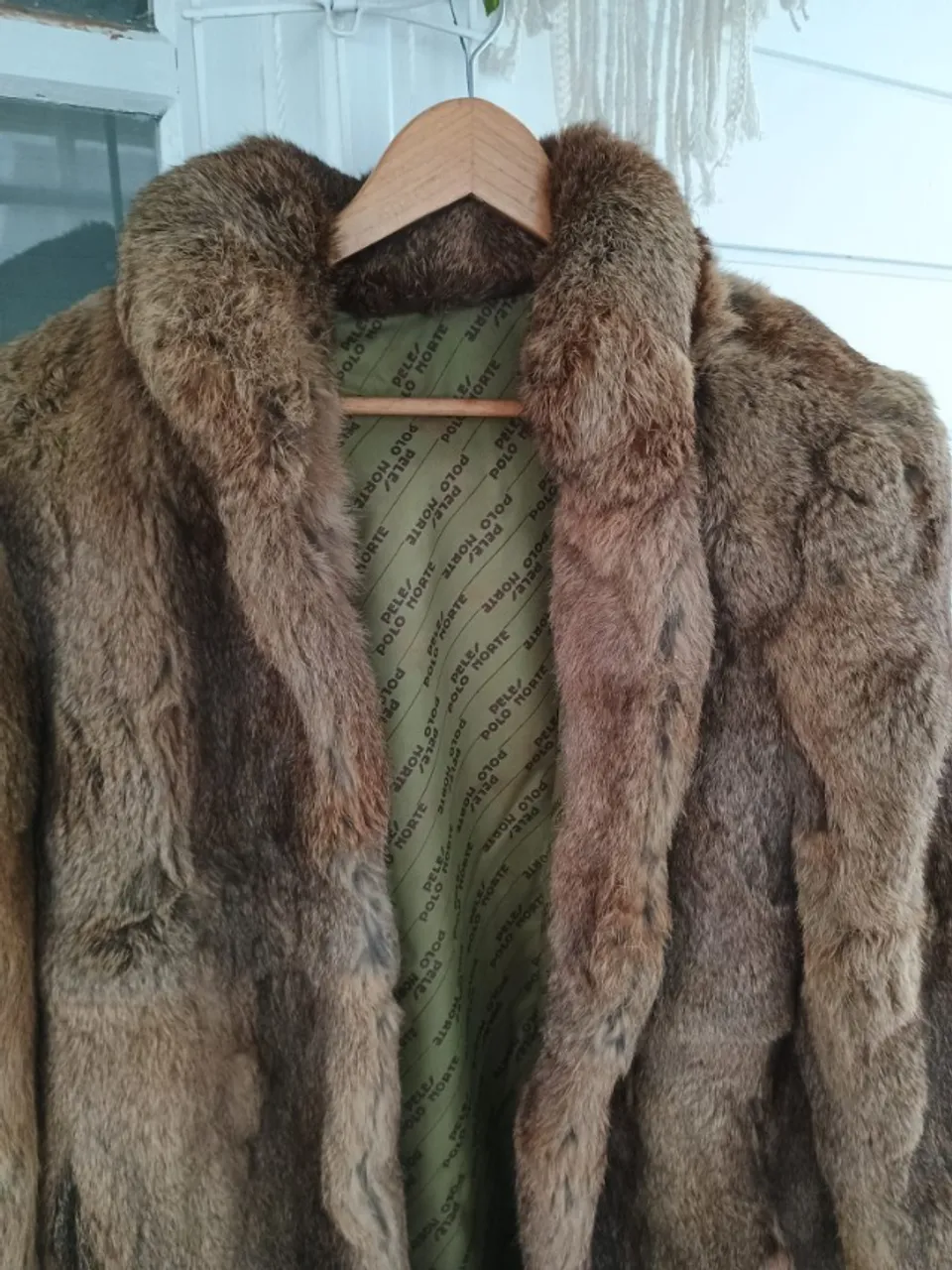 Casaco de pele de coelho marrom elegante e sofisticado. Marca Polo Norte. Ideal para os dias mais frios, com forro interno confortável e design clássico.