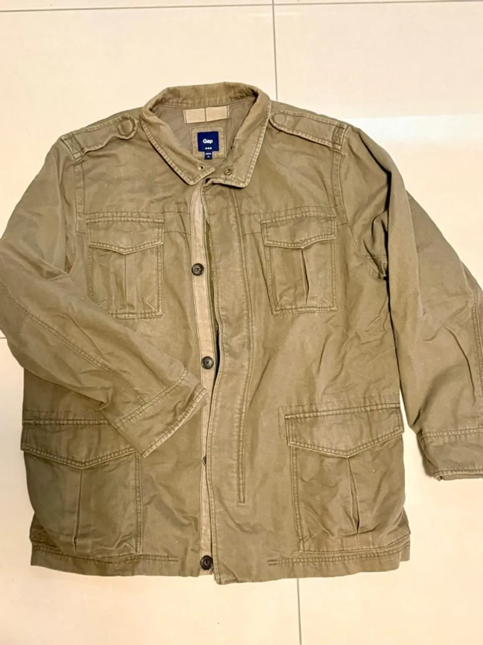 Estilo: casaco utilitário estilo field jacket/military-inspired, com bolsos frontais e corte mais casual