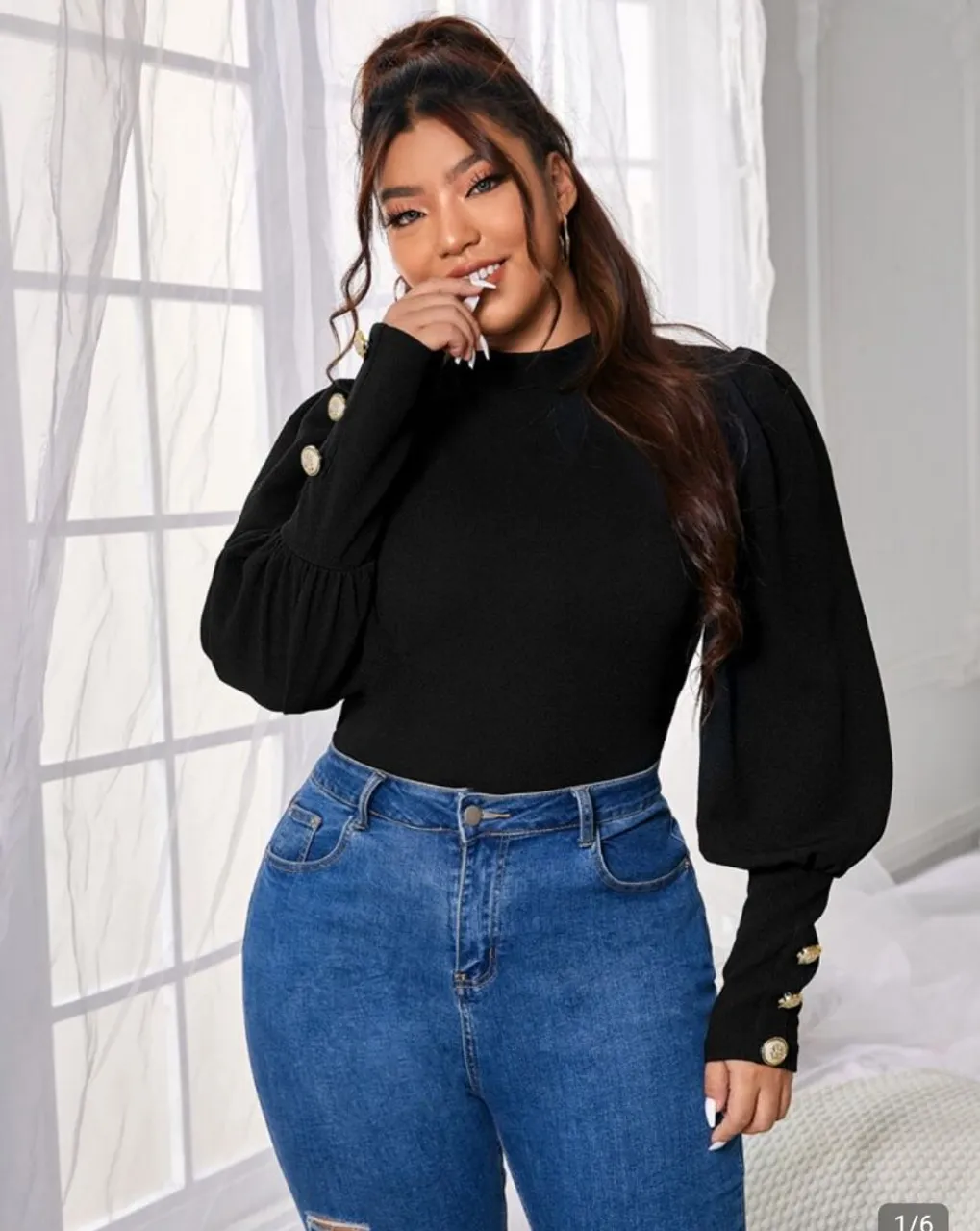 Blusa preta com mangas bufantes e detalhes em botões dourados, um clássico moderno para um visual elegante e cheio de estilo. Combine com jeans para um look casual ou com saias para ocasiões especiais. e uma blusa de gola com botões de Pérola em alfaiataria