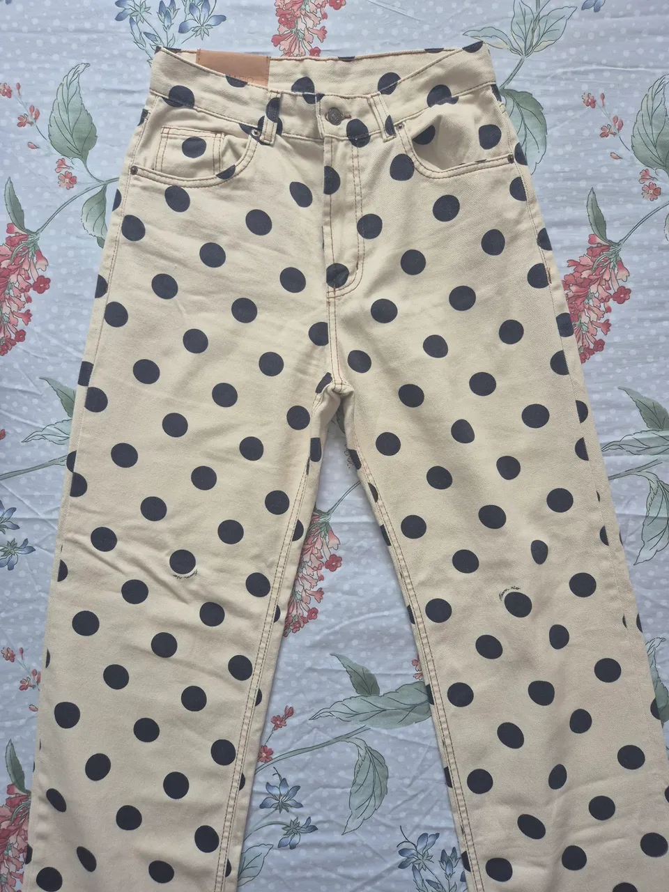 Calça de sarja super estilosa com estampa de bolinhas. Perfeita para um visual moderno e cheio de personalidade!