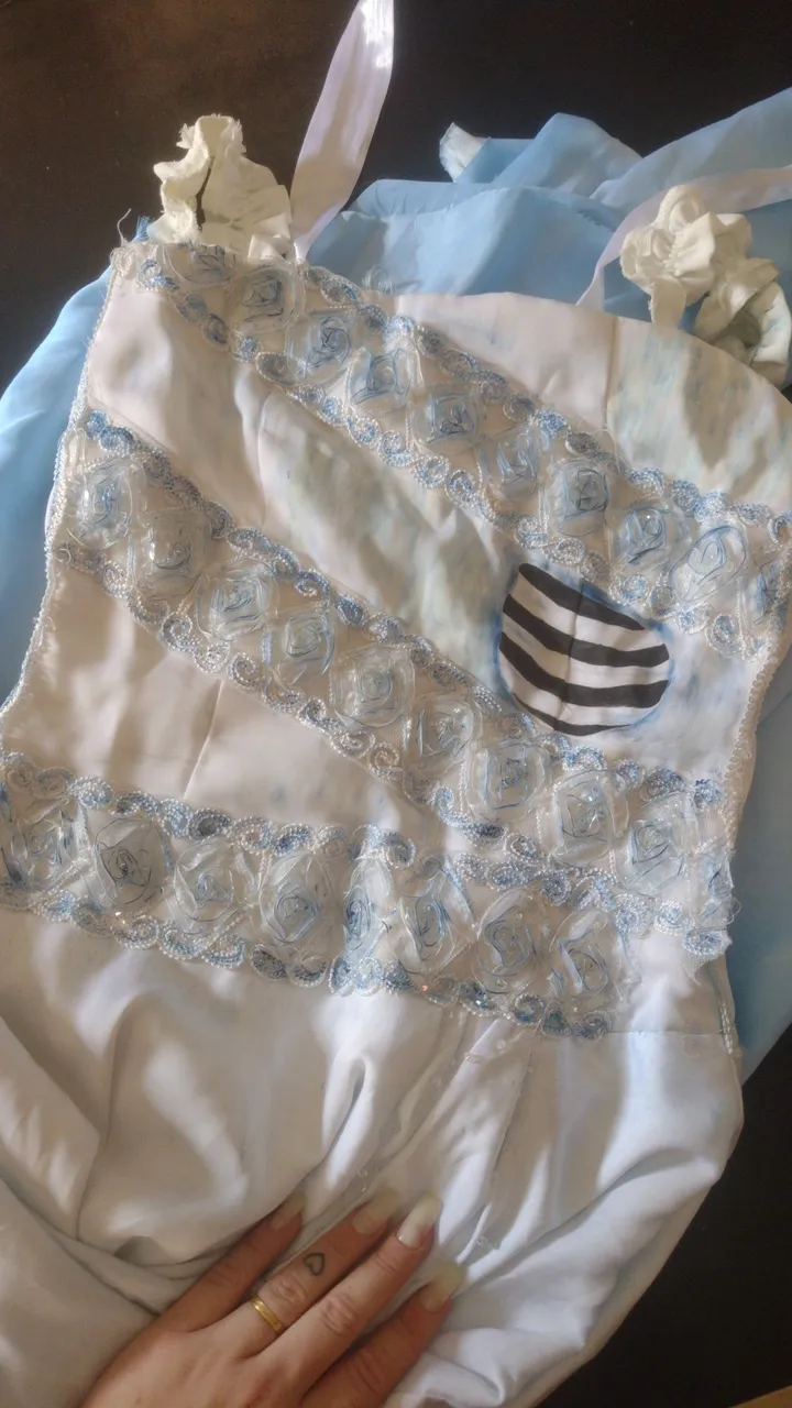 A fantasia foi feita em casa usando um vestido de noiva de verdade por isso pode ser que seja um pouco pesado ,foi usado uma vez