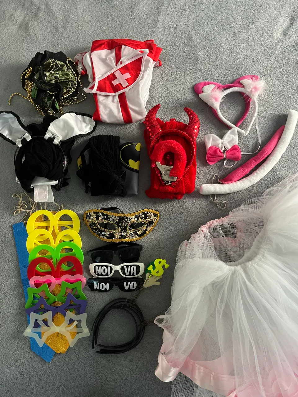 Combo de Acessórios: 1 máscara de carnaval, 5 arquinhos divertidos, 8 óculos divertidos, 1 óculos escuros, 2 óculos ?noiva e noivo?, 3 gravatas.