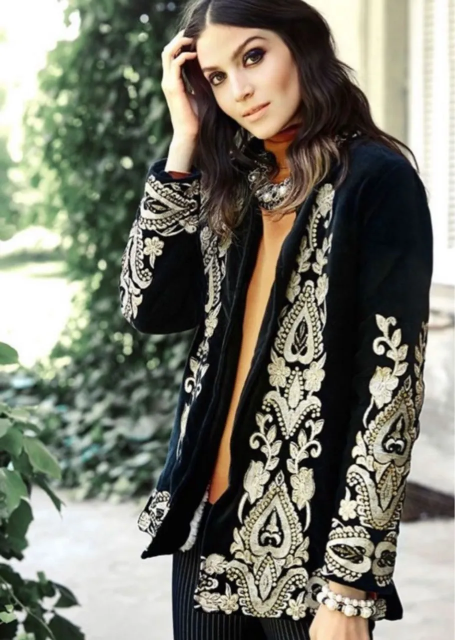 Jaqueta preta com bordados dourados, perfeita para um look sofisticado e estiloso. Detalhes que valorizam qualquer produção, ideal para diversas ocasiões.