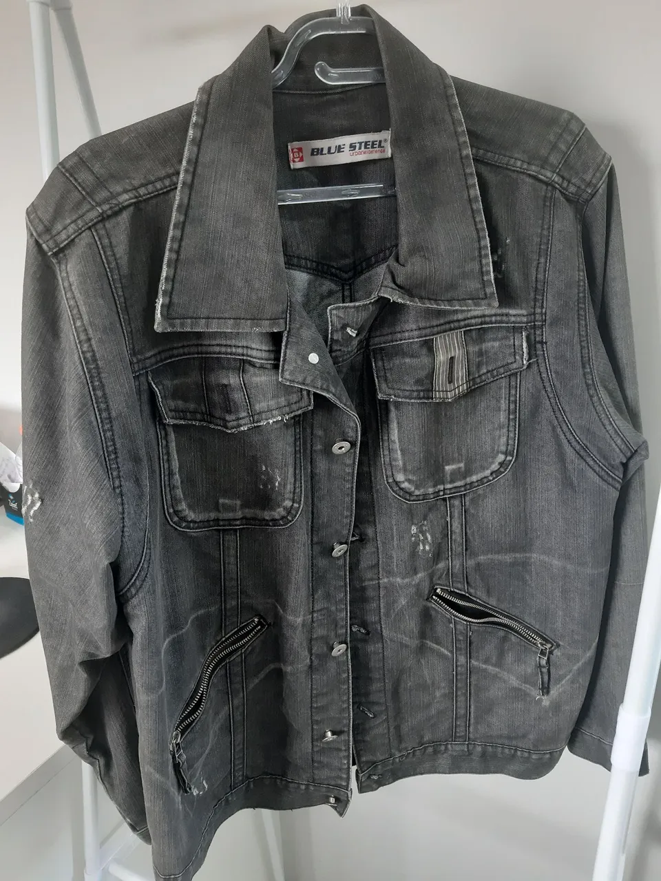 Jaqueta jeans preta Blue Steel, com bolsos e detalhes em zíper. Peça estilosa e versátil para diversas ocasiões.