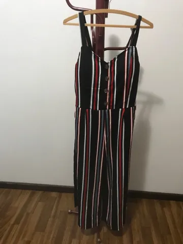 Macacão listrado, modelo pantacourt, com cinto para amarrar na cintura, botões frontais, tecido com elastano. Veste 42/44. Nunca usado.