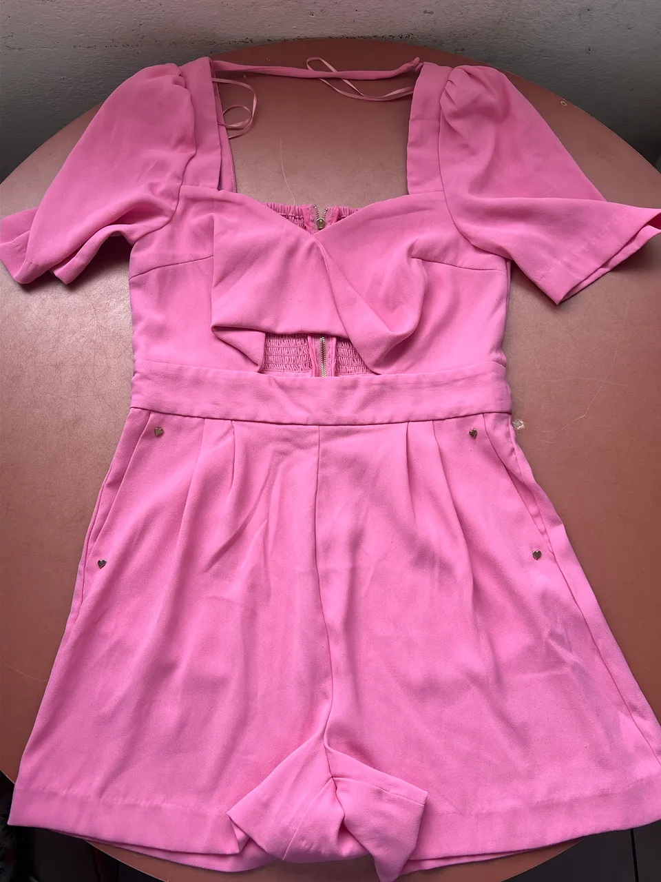 Macacão curto rosa com detalhes charmosos e design moderno. Perfeito para um look estiloso e confortável! Nunca usado.