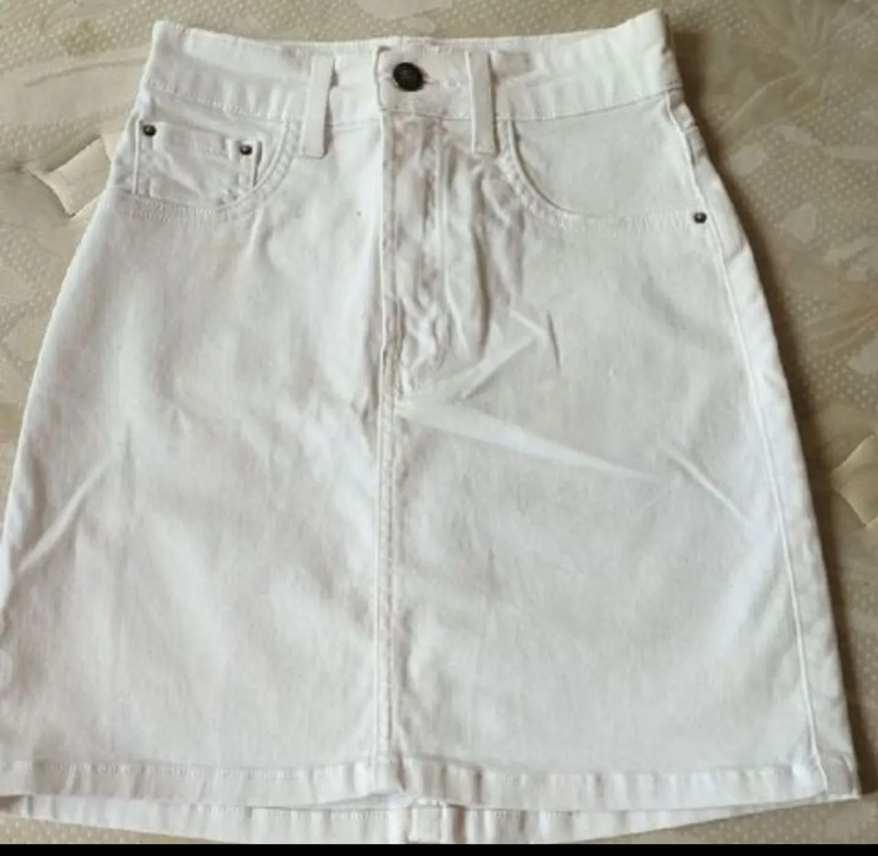 mini saia em sarja branca é a definição de versatilidade. tem um corte reto clássico, cintura média/alta e bolsos funcionais na frente e atrás. o jeans é encorpado, daqueles que modelam sem marcar nada.