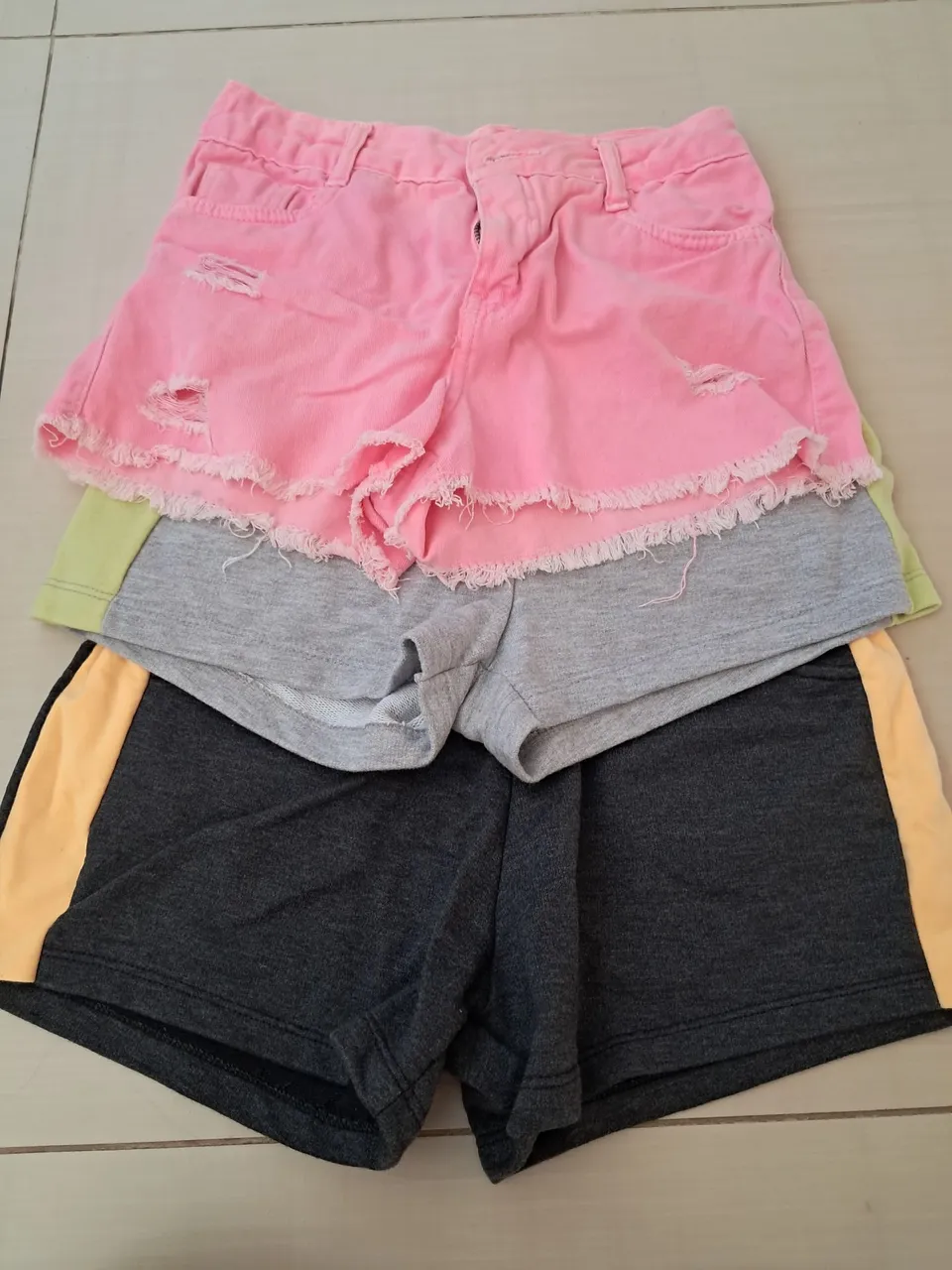 Short jeans rosa tamanho 12 Short moleton cinza claro tamanho 12 ( nunca usado) Short moleton cinza escuro tamanho 14( nunca usado)