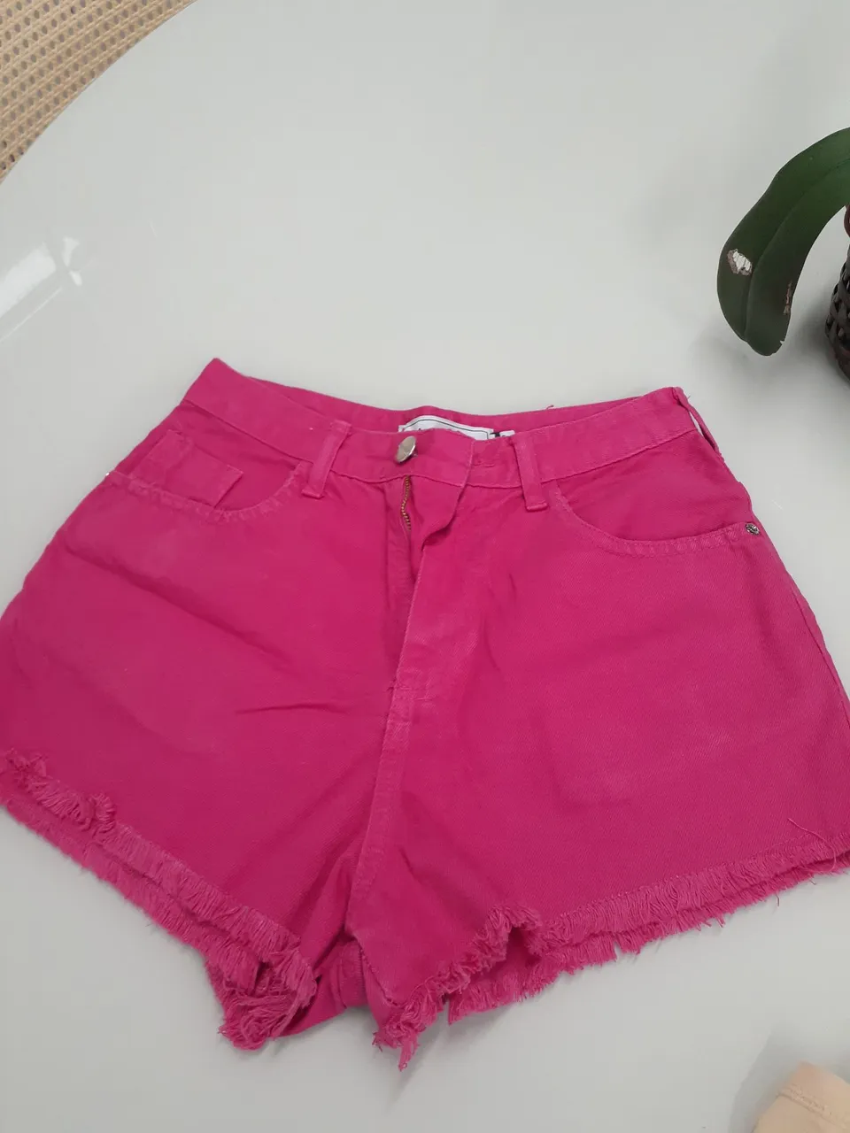 Shorts jeans rosa pink com detalhes destroyed. Perfeito para um look moderno e estiloso.