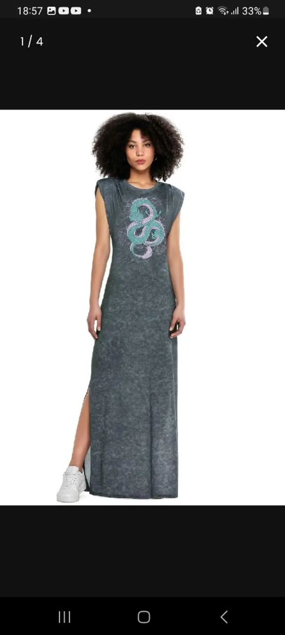 Vestido longo estiloso, com estampa de dragão. Perfeito para um visual único e cheio de personalidade.Possui abertura nas laterais. Medindo134 comprimento, quadril 112 cm