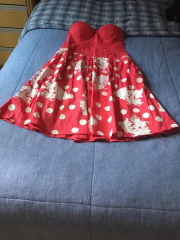 Vestido tomara que caia, cor coral com branco, forrado, evasê da cintura pra baixo. Elástico na parte de trás. Acompanha cinto. 100%algodao.