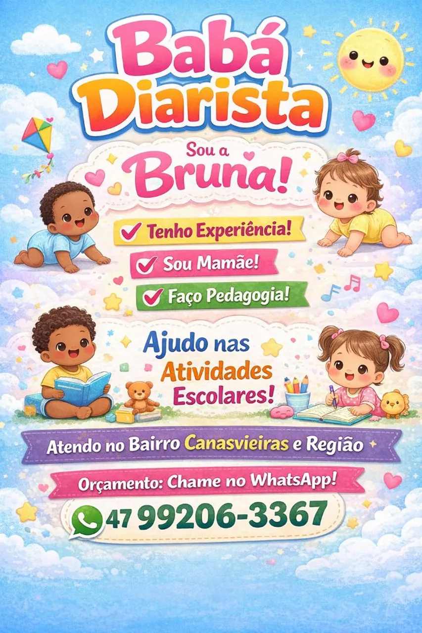 Olá! Sou a Bruna, tenho experiência com crianças e também sou mãe
