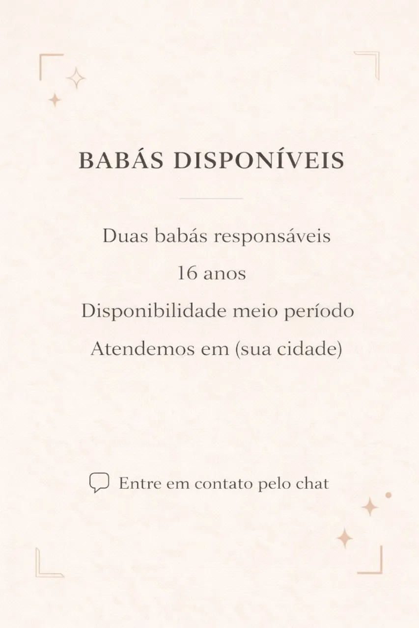 Olá! Somos duas babás de 16 anos, responsáveis e atenciosas, disponíveis para trabalhar meio período. Já temos experiência cuidando de crianças da família, auxiliando com alimentação, tarefas escolares, brincadeiras e rotina diária.