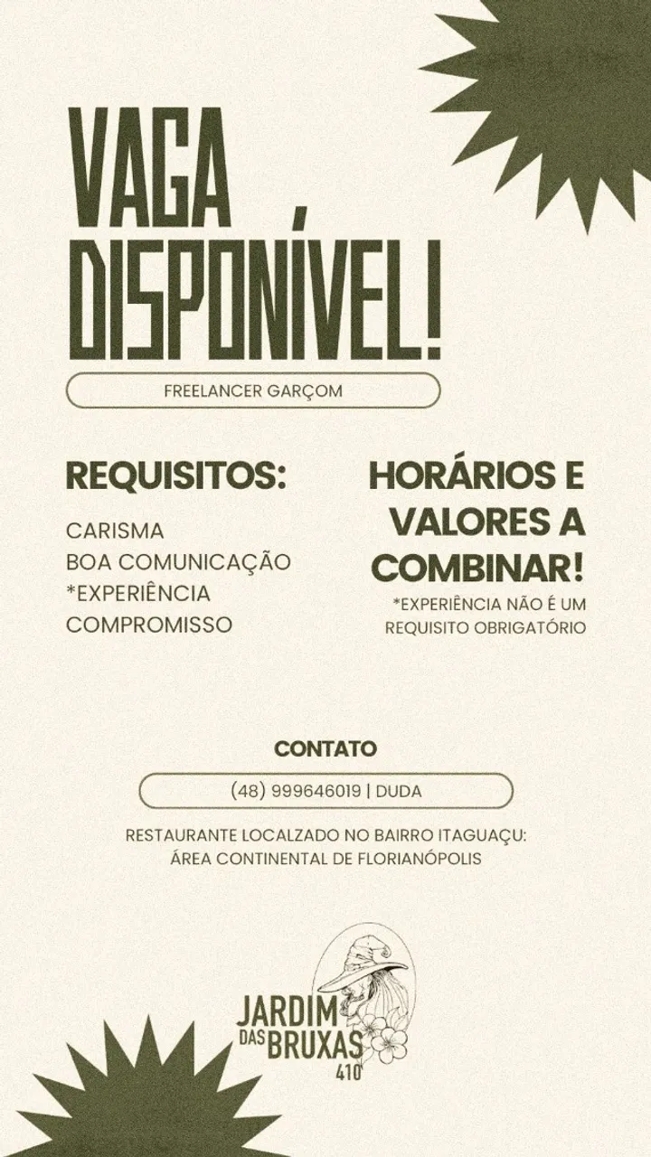 Recepcionar os clientes, atendimento de mesa, lavagem de louças. R$14 a hora - horários variados. Chamar Duda para mais informações