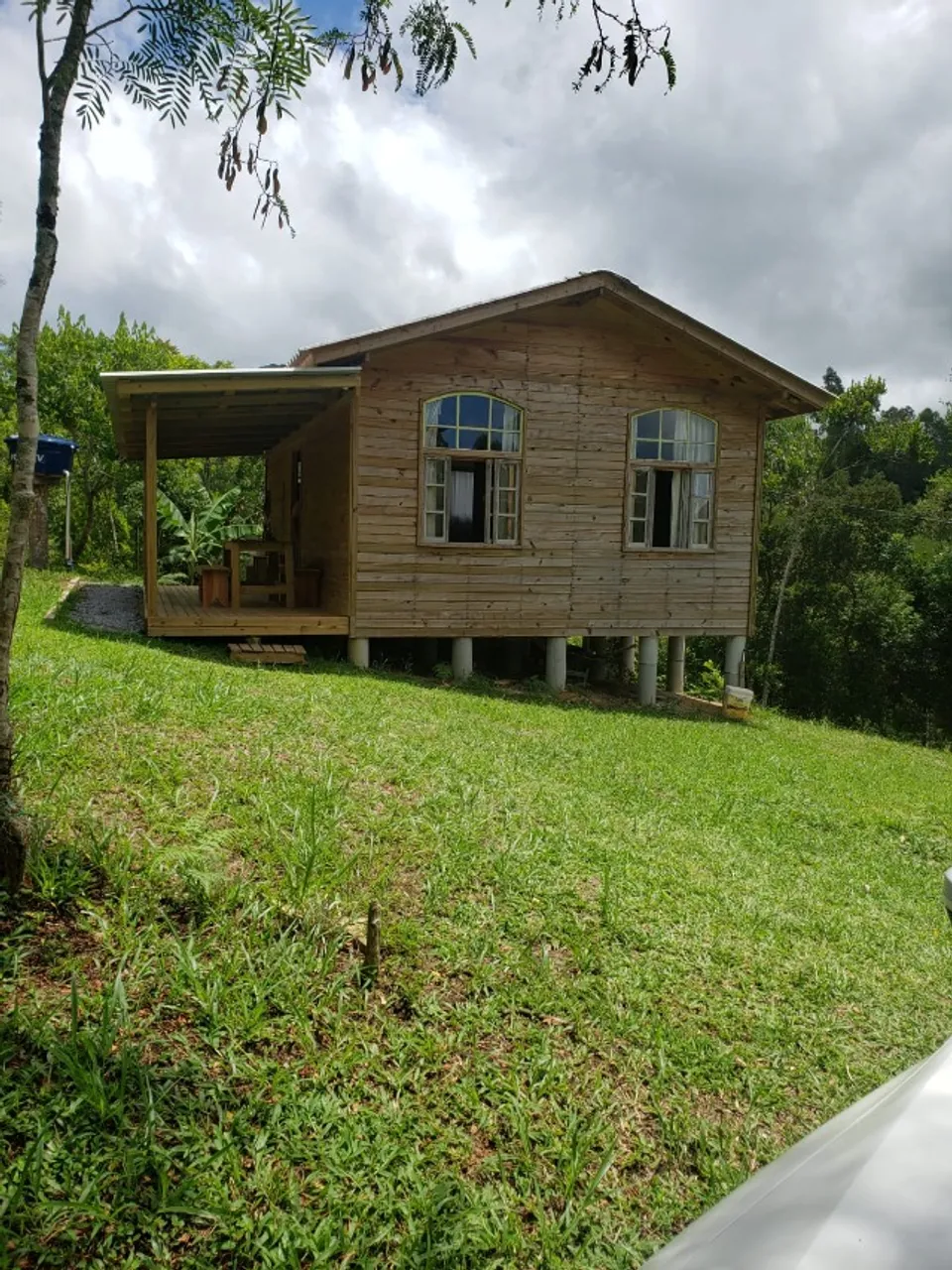Casa de mandeira com sala e cozinha conjugada, 2 quartos, banheiro, área de serviço.